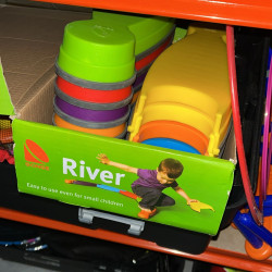 Gele, groene, donkerblauwe, lichtblauwe, paarse, rode en oranje motorika blok